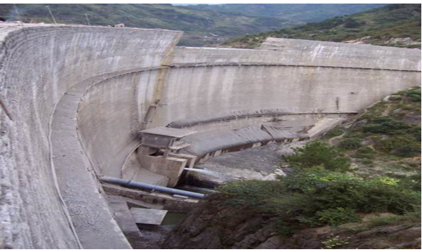 該工程位于勉縣二道河鄉(xiāng)褒河支流沙溝河中段,壩頂寬4.0m、底寬16m、壩高55m、壩頂弧長220.78m,為變?nèi)碾p曲拱壩。該壩壩體結(jié)構(gòu)復(fù)雜,此雙曲拱壩結(jié)構(gòu)為陜西第一座,技術(shù)含量較高。該工程于1998年9月1日開工,2003年1月31日竣工。